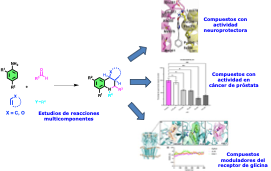 Nuestra investigación esta enfocada en el diseño, síntesis y evaluación biológica de compuestos heterocíclicos bioactivos, a través de reacciones multicomponente como la de Povarov y estrategias de Química verde. Buscando generar nuevos compuestos con potencial actividad farmacólogica, explorando su aplicación en áreas como la neuroprotección (compuestos capaces de impedir la toxicidad del petido beta amiloide, relevante en la enfermedad del Alzheimer), en el tratamiento del cáncer de próstata avanzado (inhibidores del receptor LOX-1) y en el tratamiento del dolor crónico (moduladores alostéricos positivos del receptor de glicina ⍺3). Empleando un enfoque interdisciplinario que combina la síntesis orgánica, estudios in silico y la evaluación biológica.