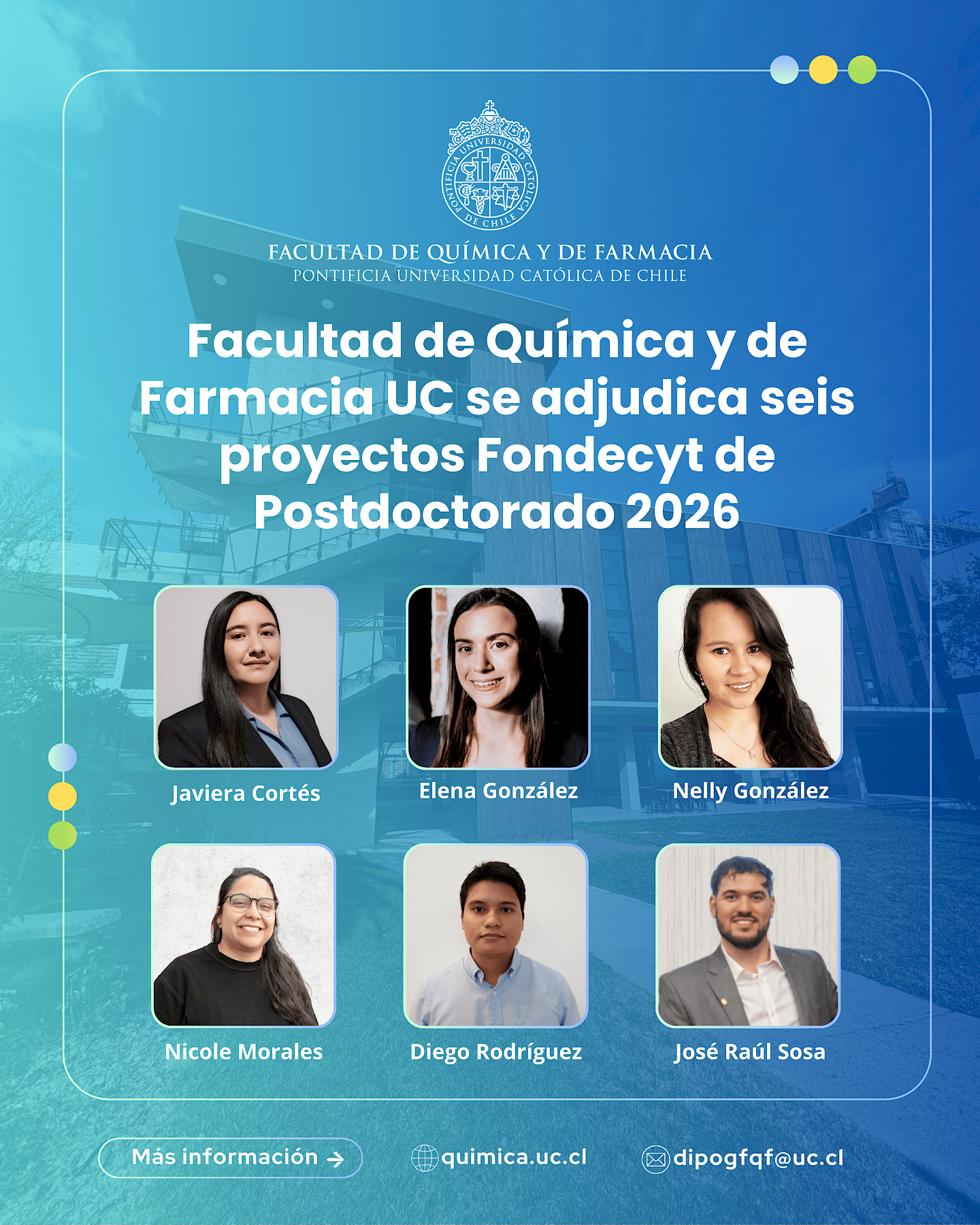 Estas adjudicaciones reflejan el aporte de la Facultad de Química y de Farmacia UC a la formación de capital humano avanzado y al fortalecimiento de nuevas trayectorias científicas, mediante la inserción de investigadoras e investigadores postdoctorales en líneas de investigación activas y consolidadas en la Pontificia Universidad Católica de Chile.